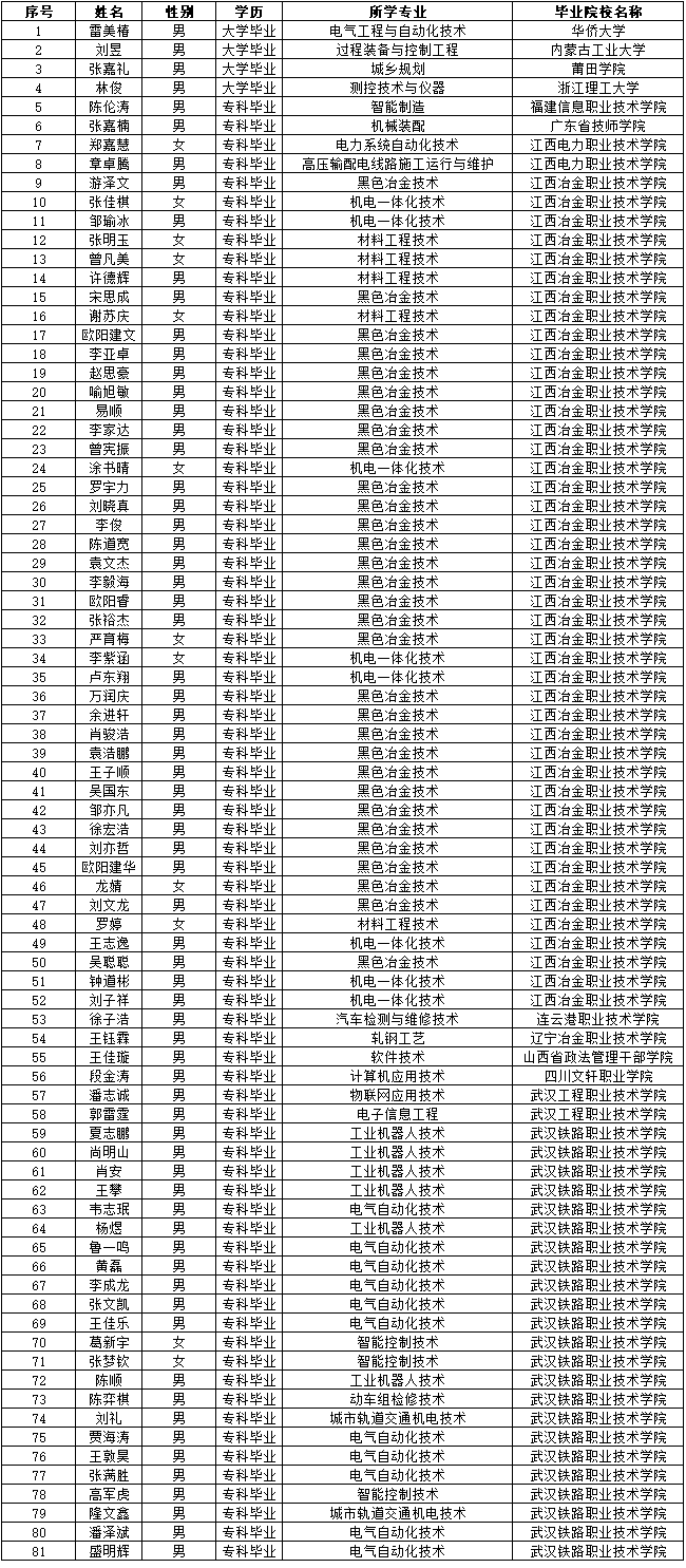 依据宝钢德盛不锈钢有限公司2023年校园招聘计划,结合中国宝武《阳光招聘具体操作指引》工作要求,通过个人自愿报名初试、复试、面试、线上测评、背景调查和入职体检各项工作,经太钢集团审批,现将2023年第二批校园招聘拟聘结果公示名单公示如下: