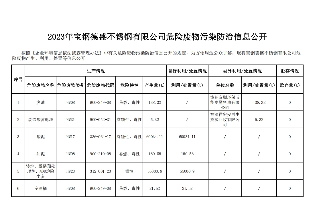 2023年宝钢德盛不锈钢有限公司危险废物污染防治信息公开